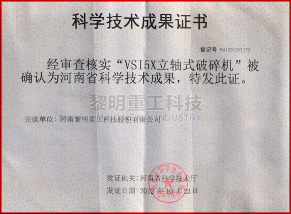 - VSI立軸式?jīng)_擊破碎機(jī)獲河南省科學(xué)技術(shù)成果 >>查看證書