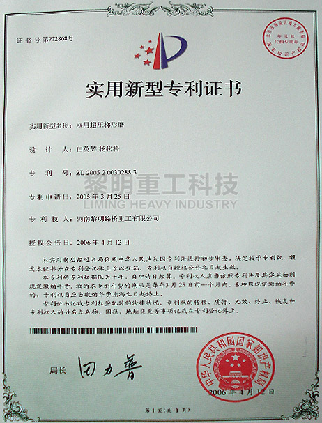 - 雙用超壓梯形磨粉機(jī)專利號(hào):ZL 200520030288.3 >>查看證書