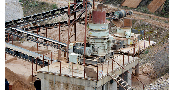 玄武巖大塊物料經(jīng)料倉由振動(dòng)給料機(jī)均勻喂料,輸送到顎式破碎機(jī)進(jìn)行粗碎,粗碎后的物料經(jīng)振動(dòng)篩篩分后,由皮帶輸送機(jī)輸送至反擊式破碎機(jī)或圓錐破碎機(jī)進(jìn)行中細(xì)碎。