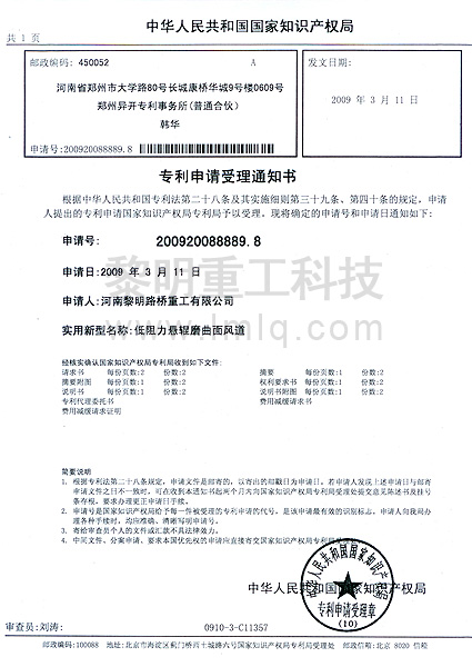 - 低阻力懸輥磨曲面風(fēng)道專利號(hào):200920088889.8 >>查看證書