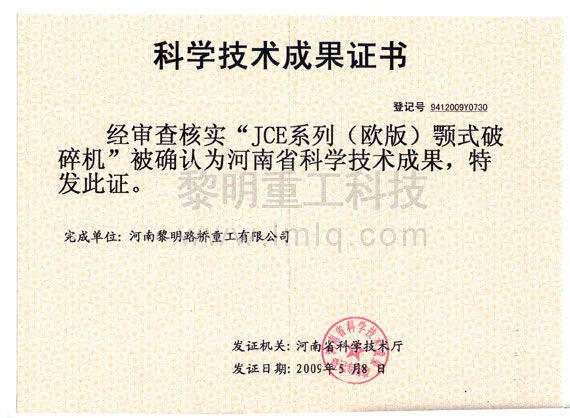 - JCE歐版顎式破碎機(jī)獲河南省科學(xué)技術(shù)成果 >>查看證書