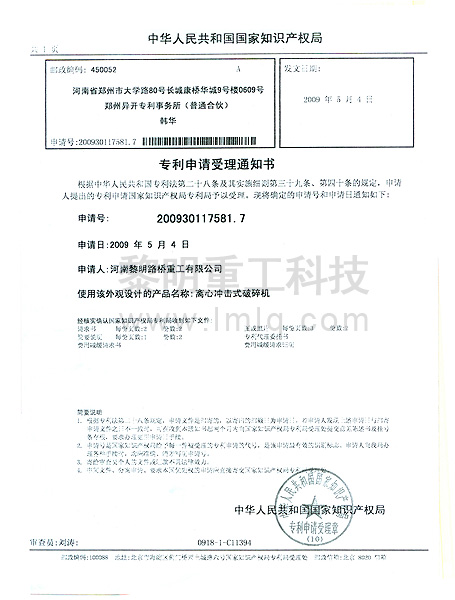 - 離心沖擊式破碎機(jī) 專利號(hào):200930117581.7 >>查看證書