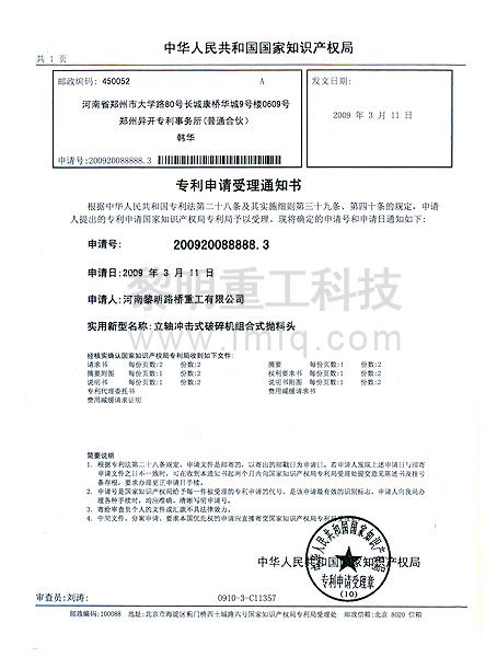 - 立軸沖擊式破碎機(jī)組合式拋料頭專利號(hào):200920088888.3 >>查看證書