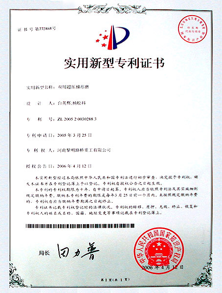 - 超壓梯形磨粉機(jī)專利號(hào):ZL 200520030288.3 >>查看證書