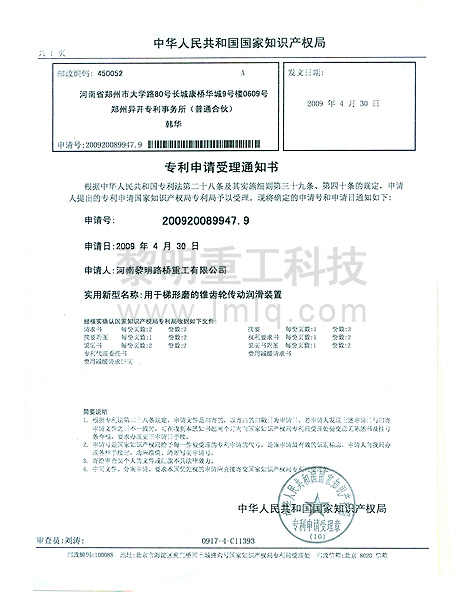 - 用于梯形磨的錐齒輪轉(zhuǎn)動(dòng)潤(rùn)滑裝置專利號(hào):200920089947.9 >>查看證書