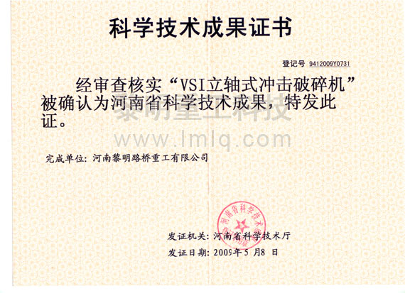- VSI立軸式?jīng)_擊破碎機(jī)獲河南省科學(xué)技術(shù)成果 >>查看證書