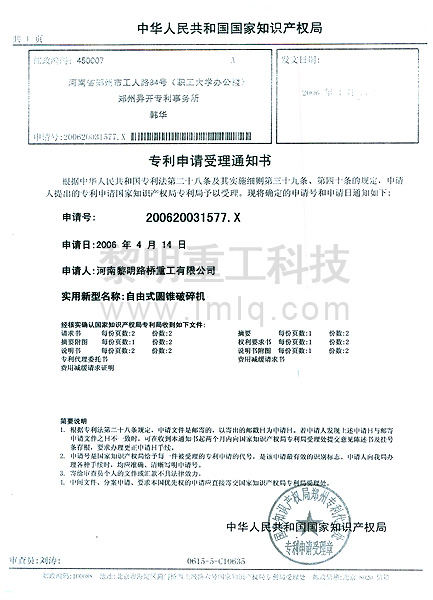 - 自由式圓錐破碎機(jī) 專利號(hào):ZL 200620031577.X >>查看證書